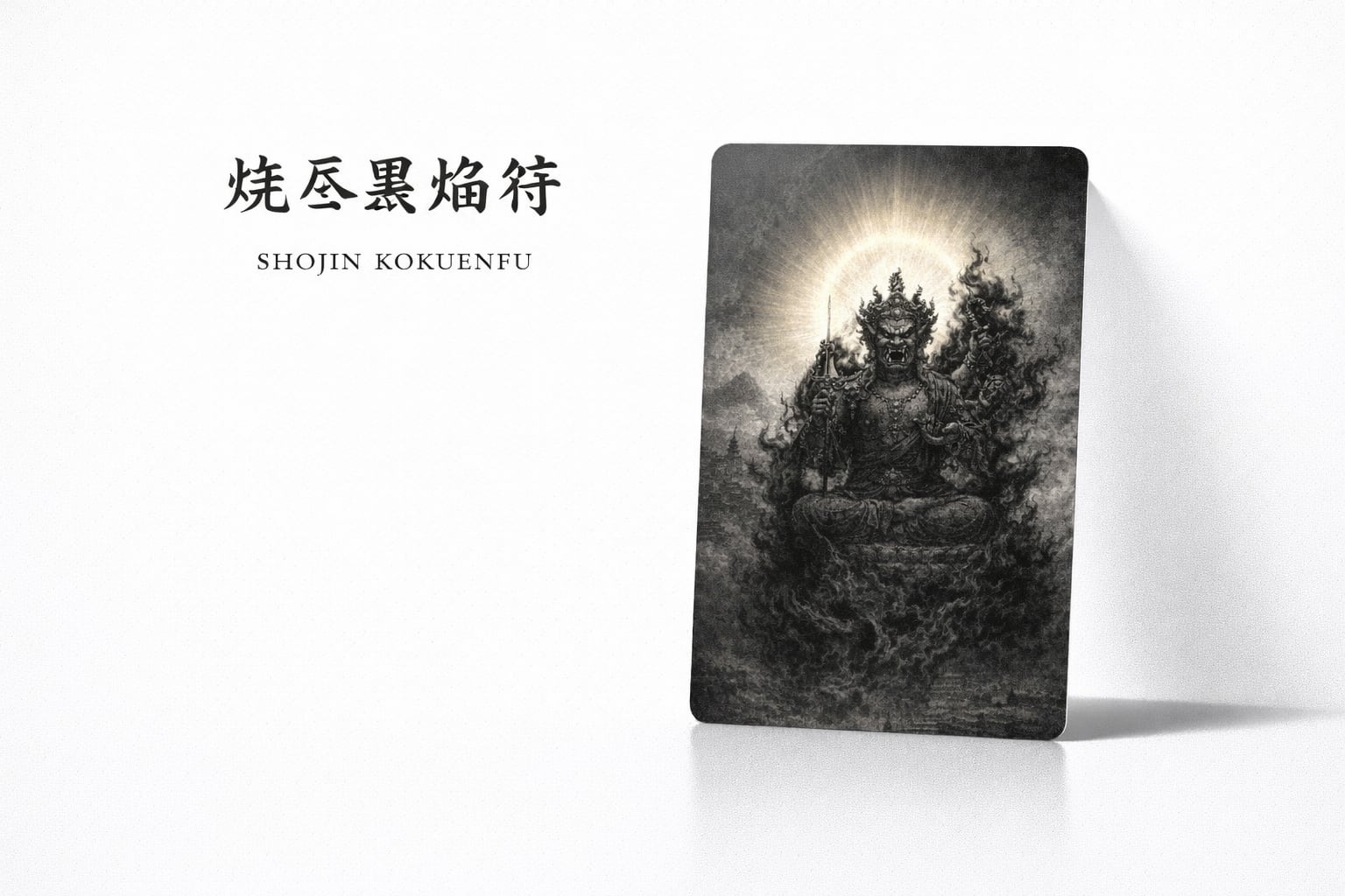 焼尽黒焔符は、魔障降伏の最高位に坐す大元帥明王の御心と法力より湧き出る「黒焔(こくえん)」の深紫の静寂を感応し、具現化した「生きた法力霊符」です。